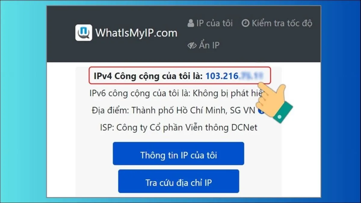 Truy cập các trang web uy tín như whatismyipaddress.com hoặc myip.com. Khi trình duyệt của bạn truy cập các trang này, máy chủ của họ sẽ tự động ghi lại và hiển thị Public IP mà router của bạn đang sử dụng. Phương pháp này đơn giản, tiện lợi, nhưng không cung cấp các thông số mạng nội bộ.