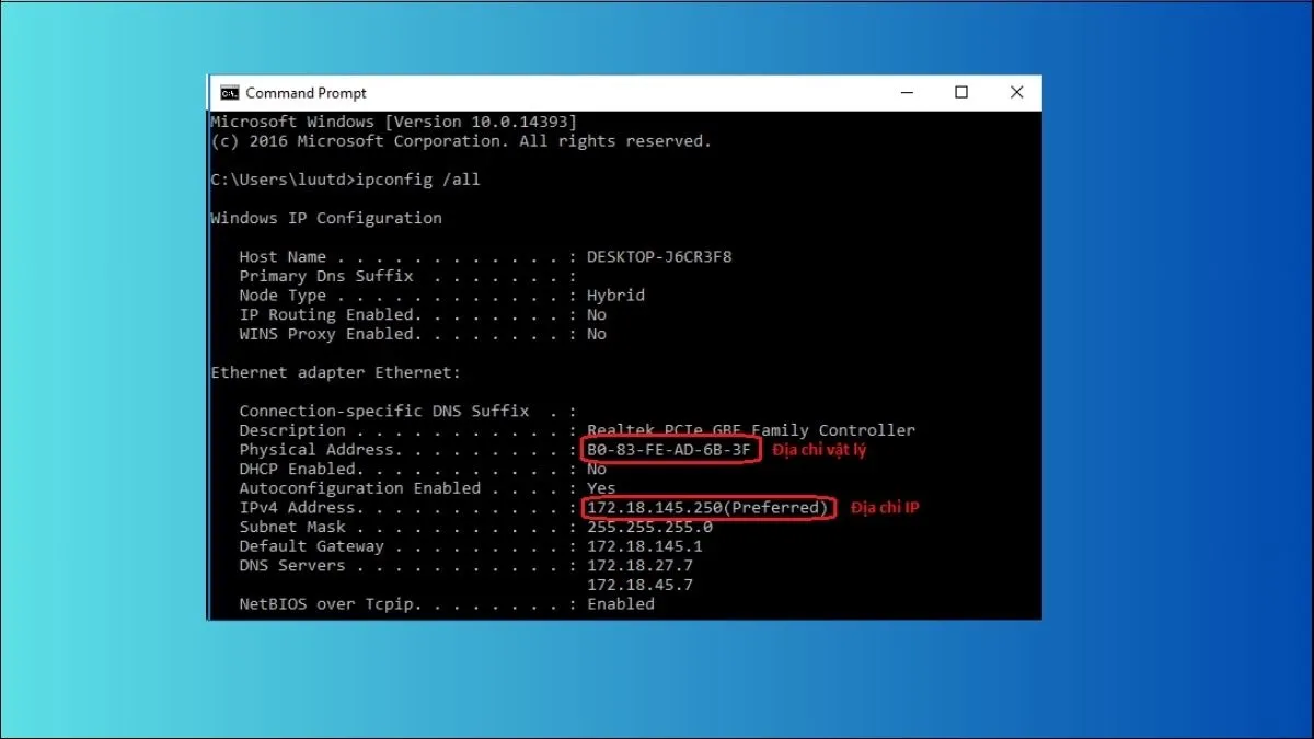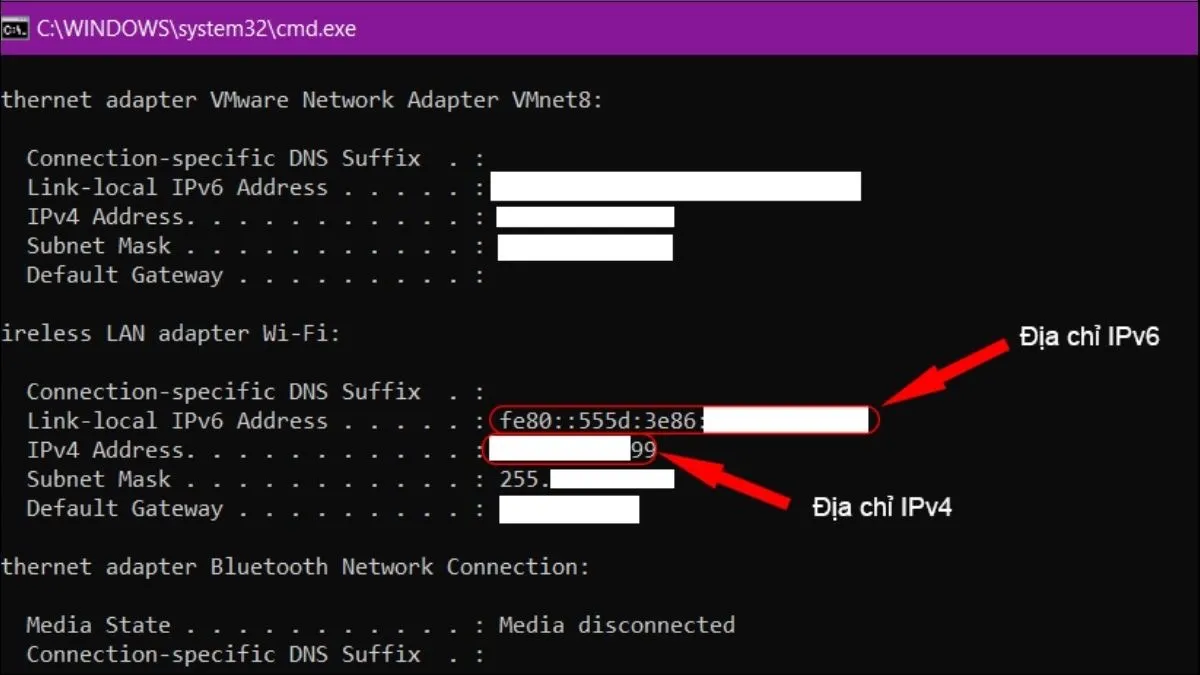 Kết quả sẽ hiển thị chi tiết các card mạng (Wireless LAN adapter Wi-Fi hoặc Ethernet adapter Ethernet). Địa chỉ IP của máy tính chính là giá trị được liệt kê bên cạnh mục IPv4 Address. Lệnh này còn cung cấp các thông số phụ như Subnet Mask và Default Gateway, rất cần thiết cho việc cấu hình router và chẩn đoán sự cố.