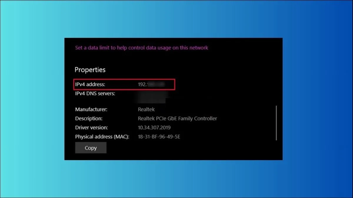 Địa chỉ IP sẽ xuất hiện tại dòng IPv4 Address. Phương pháp này cung cấp thông tin ngắn gọn nhưng đầy đủ cho các nhu cầu kiểm tra cơ bản, không cần phải thao tác với dòng lệnh phức tạp.