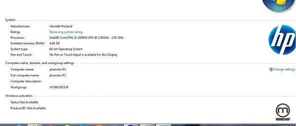 Màn hình hiển thị cửa sổ Thuộc tính Hệ thống (System Properties) trong Windows để kiểm tra cấu hình cơ bản của laptop