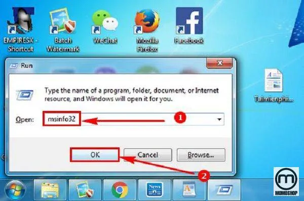 Giao diện cửa sổ Run với lệnh Msinfo32 được nhập vào, minh họa cách mở công cụ System Information để tra cứu thông tin hệ thống chi tiết