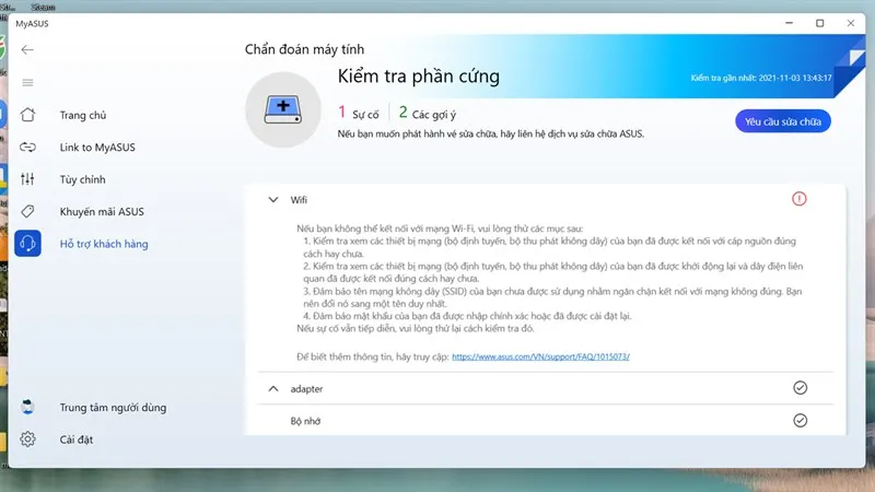 Trong trường hợp phát hiện ra lỗi, ứng dụng sẽ chỉ rõ linh kiện nào đang gặp sự cố. Báo cáo này không chỉ cung cấp mô tả ngắn gọn mà còn đề xuất các hành động cần thiết tiếp theo, như khắc phục sự cố phần mềm hoặc liên hệ với bộ phận hỗ trợ kỹ thuật của ASUS. Thông tin chi tiết này giúp người dùng dễ dàng đưa ra quyết định có nên mang máy đi bảo hành hoặc sửa chữa hay không.