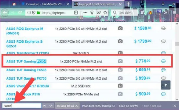 Sử dụng công cụ tìm kiếm của trình duyệt (Ctrl + F) trên các trang danh sách tương thích giúp nhanh chóng lọc ra thông tin liên quan đến model máy. Điều này giúp tiết kiệm thời gian đáng kể cho người dùng cuối.