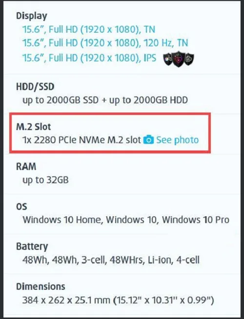 Ví dụ, sau khi tìm kiếm tên model máy, kết quả hiển thị 1x 2280 PCIe NVMe M.2 slot cho thấy máy hỗ trợ khe cắm M.2 kích thước 2280 sử dụng giao thức NVMe qua PCIe. Điều này cho phép bạn biết được loại ổ cứng cần mua.