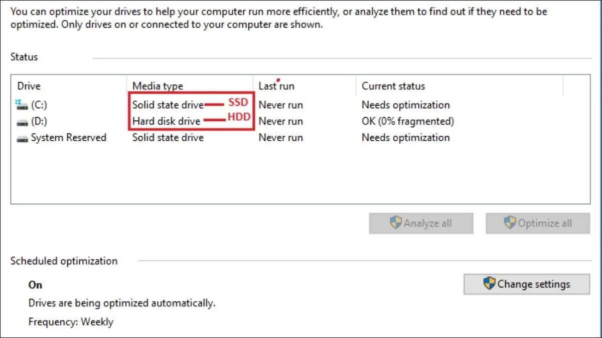 Công cụ Defragment and Optimize Drives (Tối ưu hóa Ổ đĩa) được thiết kế để duy trì hiệu suất lưu trữ. Điều quan trọng là Windows tự động nhận diện và xử lý khác nhau giữa SSD và HDD.