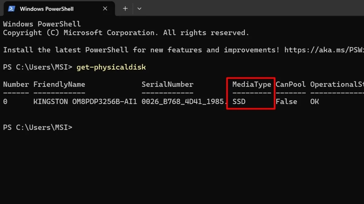 Get-PhysicalDisk - Hệ thống sẽ trả về một bảng thông tin chi tiết về tất cả các ổ đĩa vật lý. Cột MediaType sẽ hiển thị giá trị tương ứng, chẳng hạn như