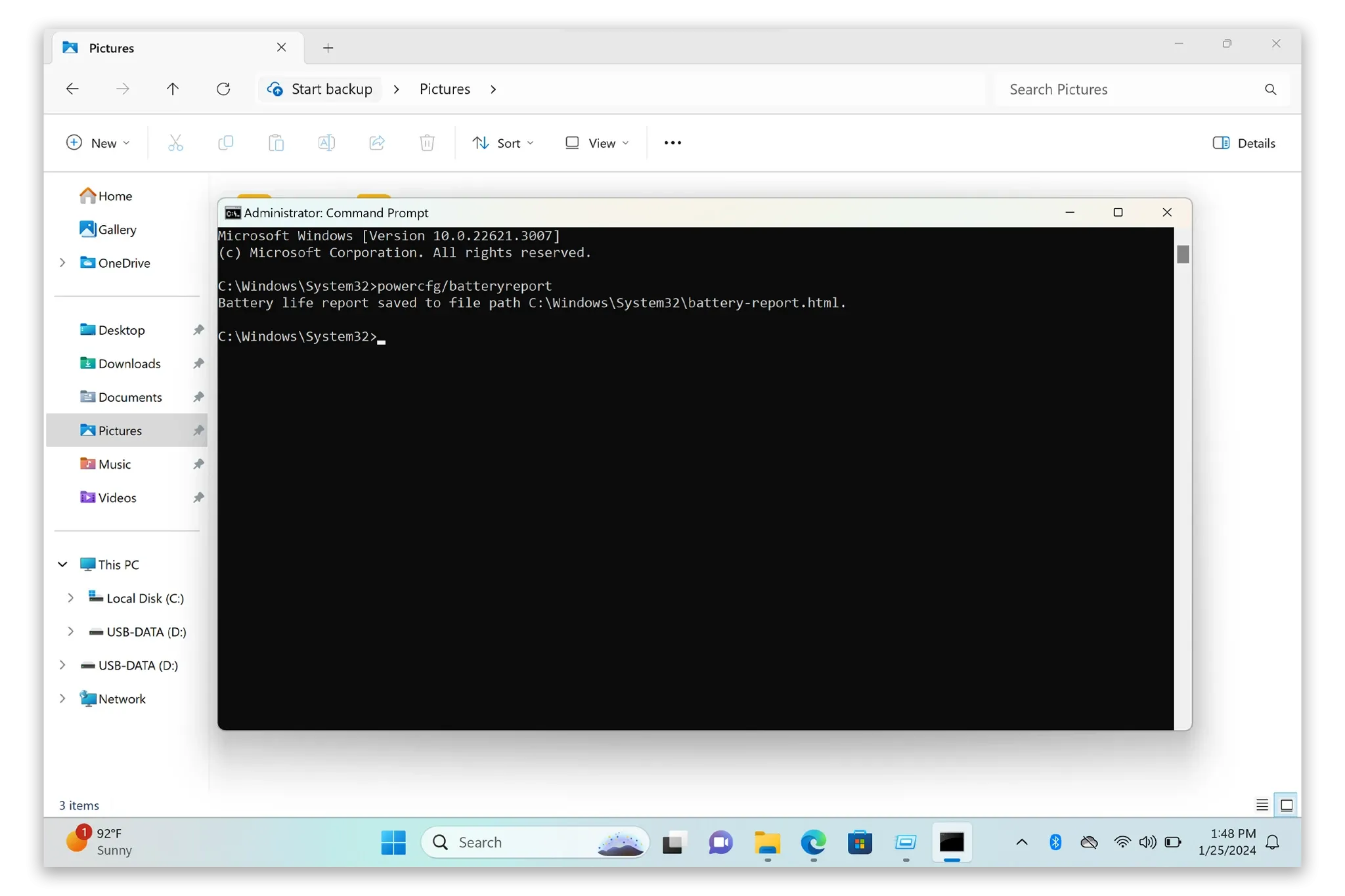 Hình ảnh giao diện Command Prompt sau khi chạy lệnh powercfg /batteryreport thành công