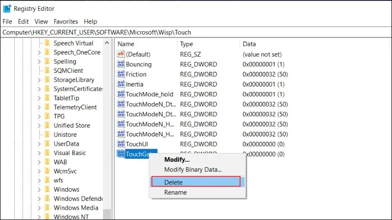 Nếu giá trị “TouchGate” tồn tại và được đặt là 0, nó đã vô hiệu hóa chức năng cảm ứng. Để bật lại, hãy nhấp chuột phải vào “TouchGate” và chọn “Delete” (Xóa). Xác nhận quyết định của bạn khi được hỏi.
