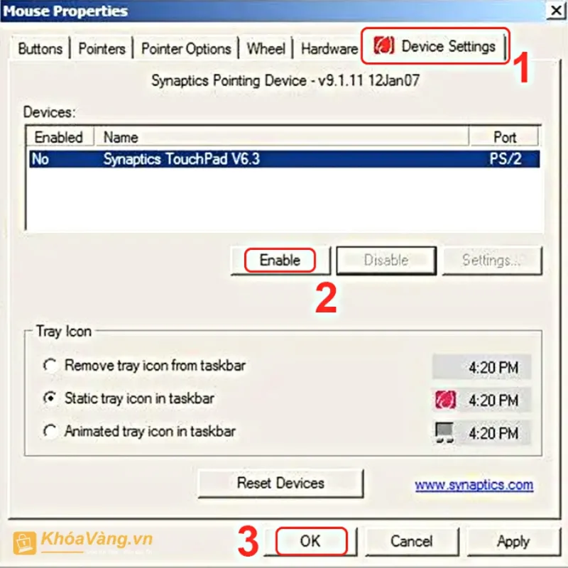 Kích hoạt lại chuột cảm ứng trong Device Settings