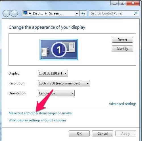 - Trong cửa sổ thiết lập Screen Resolution, chọn mục Make text and other items larger or smaller.