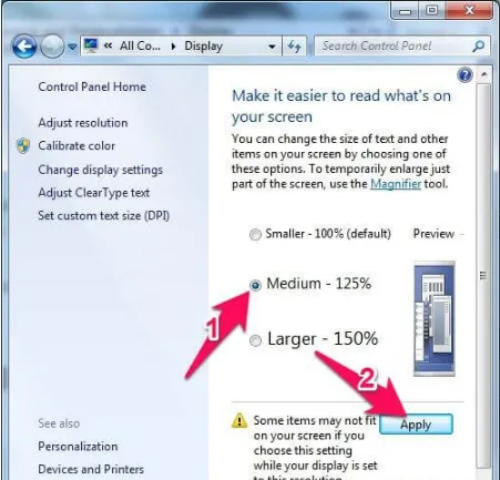 - Bạn sẽ có các tùy chọn kích thước sẵn có: Smaller (100%), Medium (125%) và Larger (150%). Hãy chọn một trong các tùy chọn này.