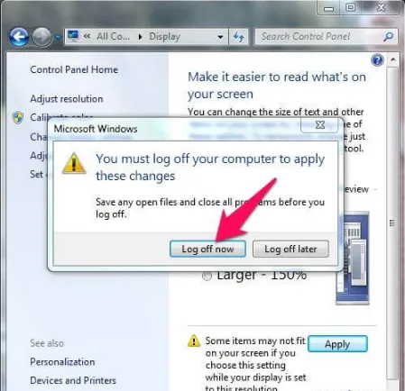 Lưu ý rằng sau khi điều chỉnh tỷ lệ, một số ứng dụng có thể yêu cầu người dùng đăng xuất và đăng nhập lại (Sign out now) để Windows tải lại toàn bộ Tăng kích thước phông chữ mới.