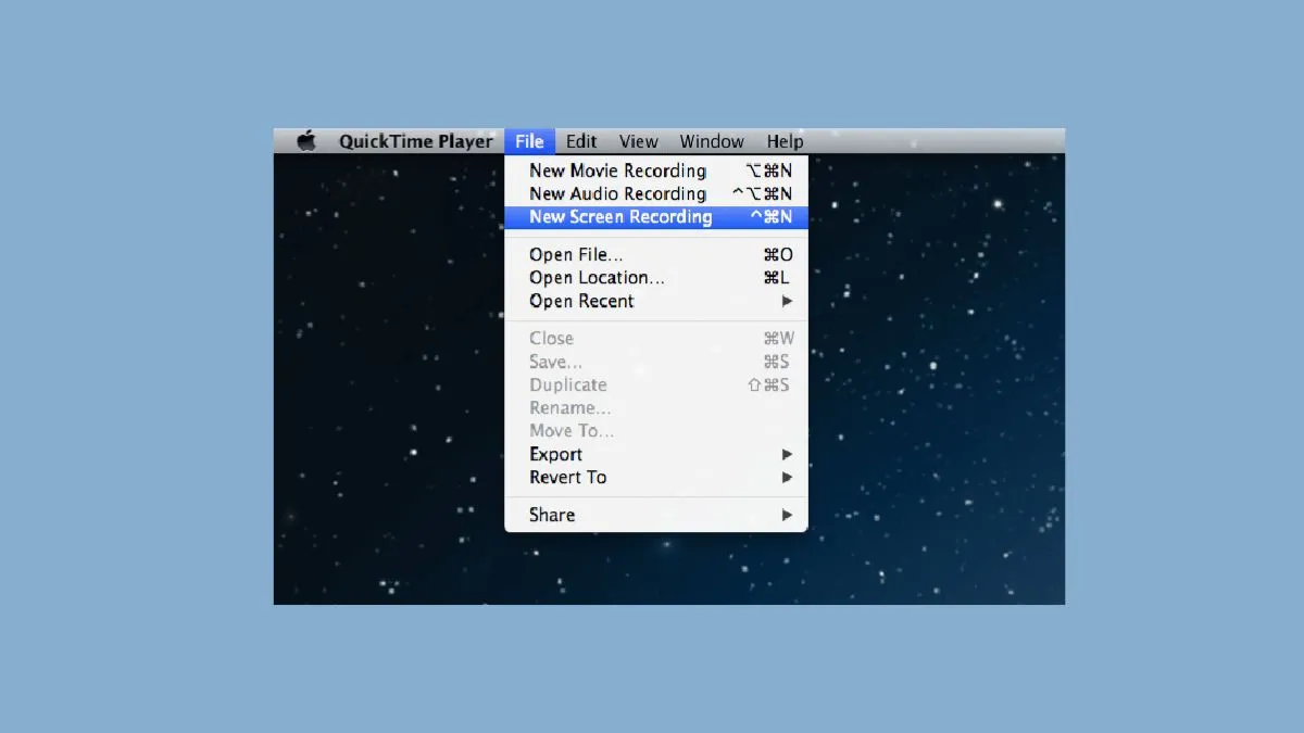 Để bắt đầu, bạn vào thư mục Applications, mở QuickTime Player. Sau đó, chọn File và tiếp tục chọn New Screen Recording. Thao tác này sẽ mở ra cửa sổ ghi hình của QuickTime.