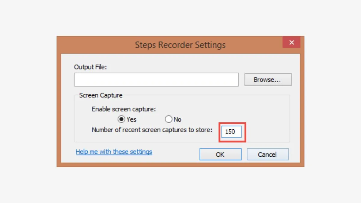 Trước khi bắt đầu ghi, bạn nên vào phần Settings (biểu tượng dấu hỏi chấm) để cấu hình một số tùy chọn cơ bản. Trong cài đặt, bạn có thể chọn nơi lưu trữ (Output location) và số lượng ảnh chụp màn hình tối đa được lưu. Cài đặt mặc định là 25 màn hình, đủ cho các thao tác ngắn.