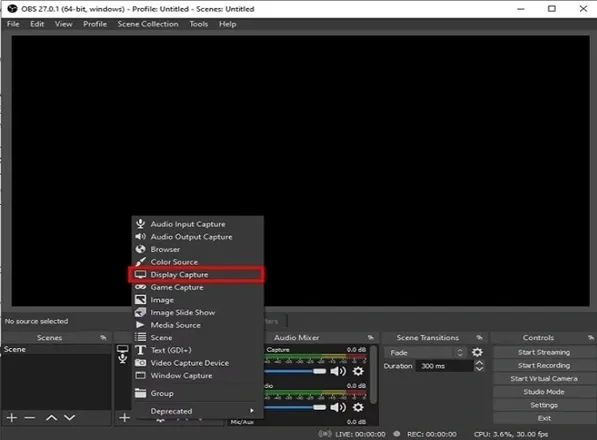 Trong cách record trên laptop bằng OBS, bạn cần thêm nguồn (Source) là Display Capture (Ghi màn hình) hoặc Window Capture (Ghi cửa sổ) vào Cảnh của mình. Sau đó, điều chỉnh thanh trượt âm thanh cho micro và âm thanh hệ thống.