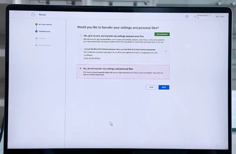 Lựa chọn giữ lại hay xóa dữ liệu người dùng trong quá trình reset Windows Dell