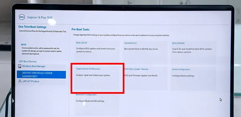 Lựa chọn SupportAssist OS Recovery trong menu Boot Option để bắt đầu khôi phục cài đặt gốc Dell