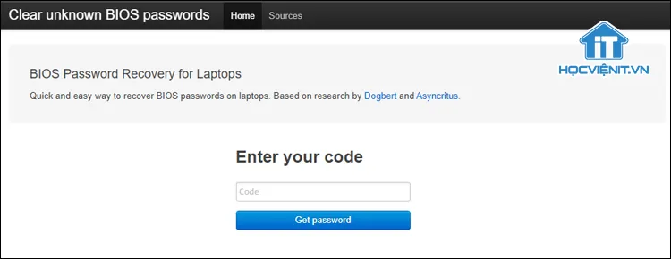 Sau khi có mã số lỗi, bạn có thể truy cập các dịch vụ trực tuyến như BIOS Master Password Generator (https://bios-pw.org/ – ví dụ minh họa). Người dùng chỉ cần nhập mã số đã ghi lại vào trường “Enter your code” và nhấn nút “Get password”.