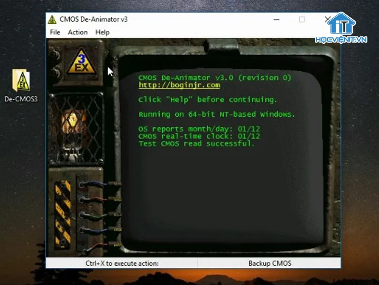 CMOS De-Animator là một tiện ích hoạt động trực tiếp trong môi trường Windows (tương thích 32-bit và 64-bit). Chức năng chính của nó là vô hiệu hóa hệ thống kiểm tra của bộ nhớ CMOS, qua đó cho phép đặt lại các thiết lập về trạng thái mặc định mà không cần tháo lắp phần cứng.
