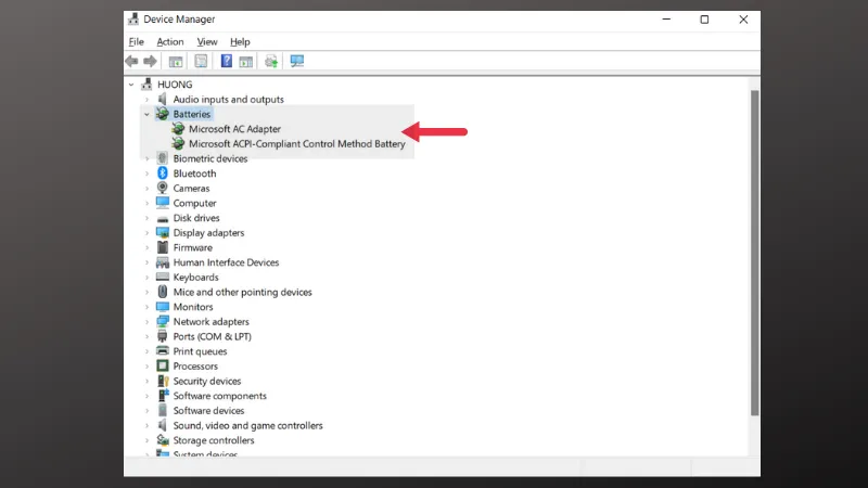 Windows + X, sau đó chọn Device Manager. - Mở rộng mục Batteries.