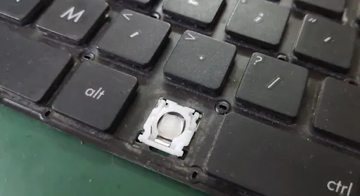 Sau khi phím được gỡ, bạn sẽ thấy cơ cấu xương chữ X. Kiểm tra xem có bị gãy, biến dạng, hoặc dính chất lỏng khô cứng không. Sử dụng cọ nhỏ hoặc tăm bông đã thấm cồn để làm sạch triệt để cơ cấu này. Đảm bảo mọi bộ phận đều khô ráo hoàn toàn trước khi lắp lại.