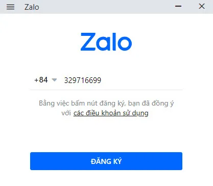 Form đăng ký Zalo PC bằng số điện thoại mới