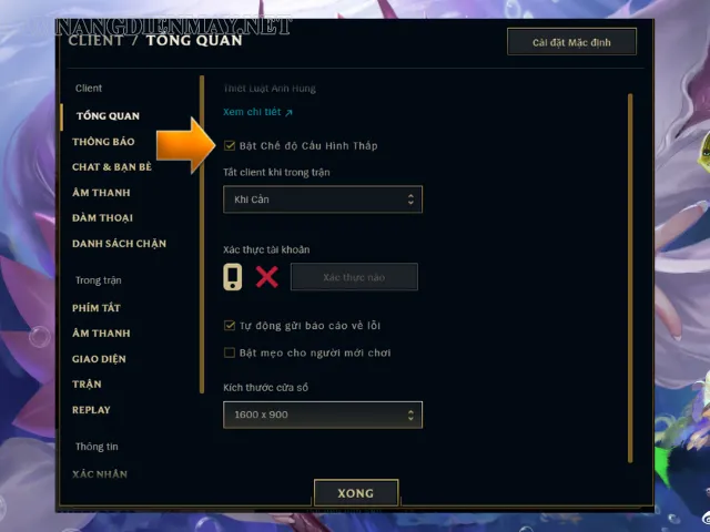 Chế độ cấu hình thấp sẽ vô hiệu hóa các hoạt ảnh và hiệu ứng không cần thiết. Thao tác này giúp giảm tiêu thụ RAM và CPU trước khi vào game.