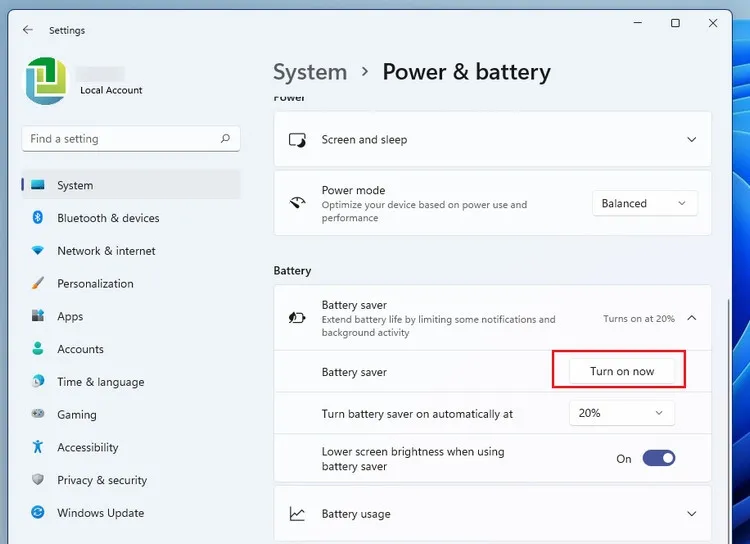Trong mục Power & battery, bạn sẽ thấy phần Battery saver (Tiết kiệm pin). Nếu chế độ này đang hoạt động, sẽ có tùy chọn để tắt nó ngay lập tức. Hãy tìm và nhấp vào nút Turn off Now (Tắt ngay) để ngừng giới hạn hiệu suất.