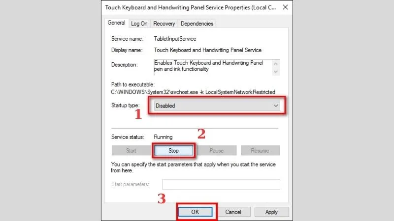 Thiết lập Startup type thành Disable để tắt Service Touch Keyboard giúp vô hiệu hóa chuột cảm ứng