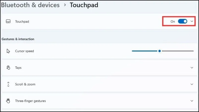 Cửa sổ Touchpad Settings sẽ hiển thị một nút gạt On/Off ở đầu trang. Chỉ cần nhấp vào nút này để chuyển trạng thái Touchpad từ “On” sang “Off”. Điều này sẽ vô hiệu hóa hoàn toàn khả năng cảm ứng của bề mặt Touchpad.