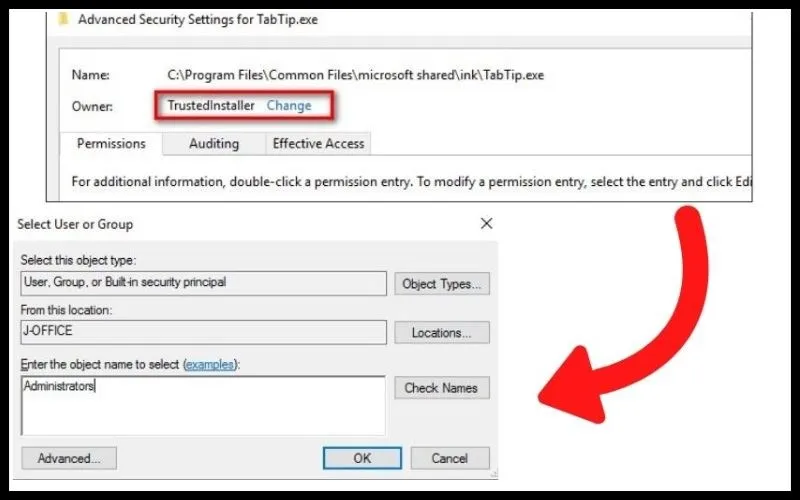 Trong cửa sổ Advanced Security Settings, tìm mục Owner (Chủ sở hữu). Nhấn Change (Thay đổi) và gõ tên tài khoản Administrator hoặc tên người dùng hiện tại vào ô. Sau đó, nhấn OK.
