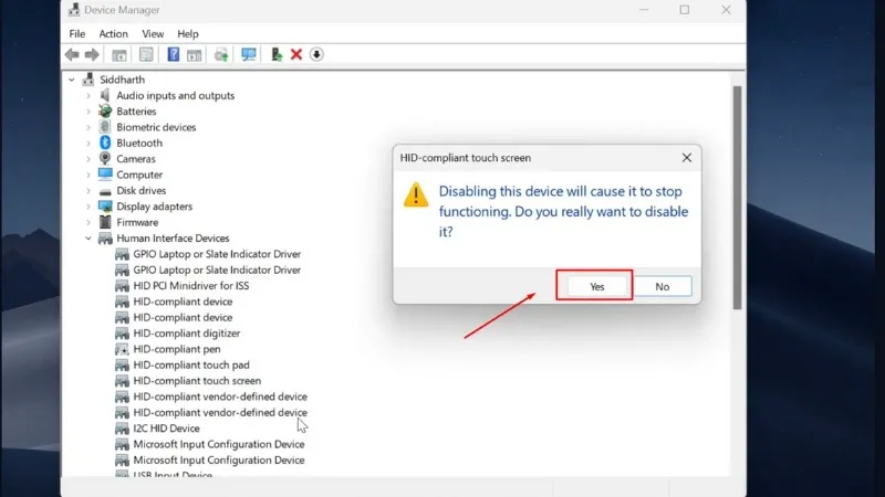 Xác nhận việc vô hiệu hóa bằng cách chọn Yes để hoàn tất quá trình tắt màn hình laptop win 10 bằng phương pháp Device Manager. Sau khi thao tác, tính năng cảm ứng trên màn hình sẽ ngừng hoạt động ngay lập tức, và bạn không cần khởi động lại máy tính.