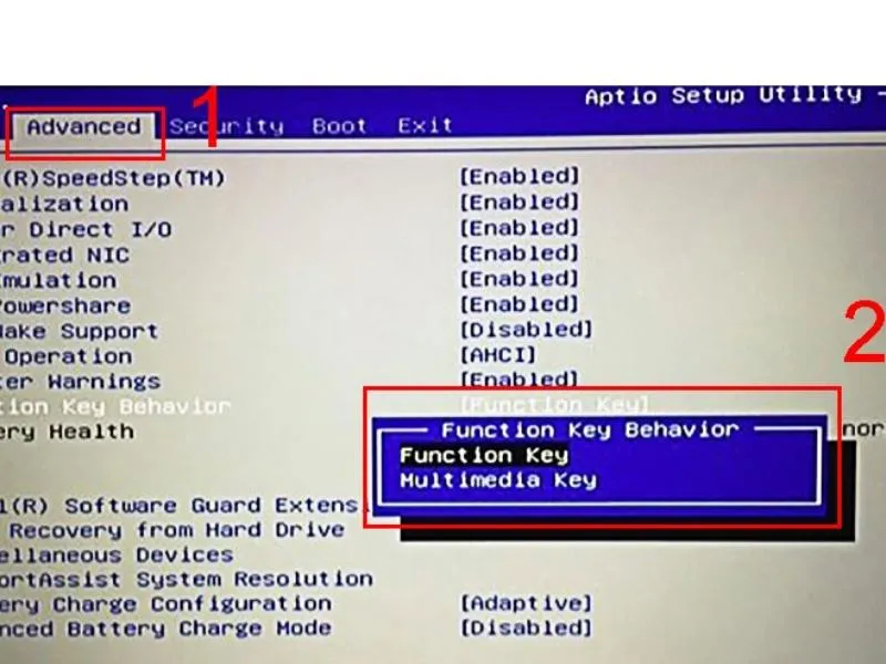 Mô tả giao diện tùy chỉnh Function Key Behavior hoặc tương tự trong BIOS/UEFI, cho phép người dùng lựa chọn giữa Function Key và Multimedia Key.