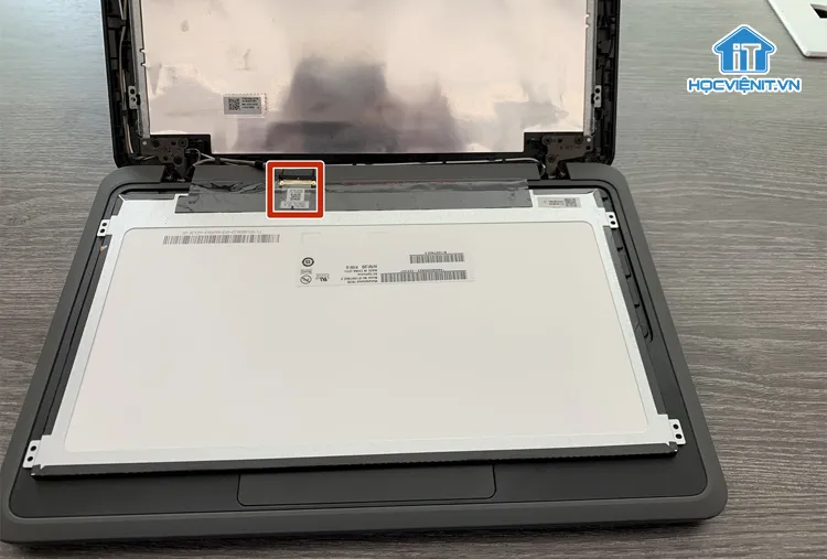 Khi các ốc đã được tháo, cẩn thận nghiêng panel màn hình ra khỏi khung, để mặt hiển thị nằm úp xuống bàn phím. Thao tác này giúp lộ ra mặt sau của panel, nơi đặt cáp tín hiệu.