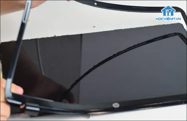 Đây là bước đòi hỏi sự kiên nhẫn và kỹ thuật cao nhất trong quy trình cách tháo màn hình laptop hp. Sau khi tháo ốc, khung viền vẫn được giữ bởi các lẫy nhựa hoặc đôi khi là keo dán (đặc biệt ở các dòng mỏng, hoặc màn hình cảm ứng).