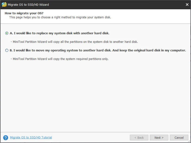 Chương trình sẽ hiển thị hai tùy chọn: Tùy chọn A cho phép di chuyển toàn bộ ổ cứng (thay thế hoàn toàn ổ cũ), trong khi tùy chọn B chỉ di chuyển hệ điều hành. Để thực hiện cách thay ổ cứng laptop hoàn chỉnh, bạn nên chọn A và nhấn Next.