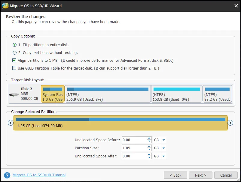 Màn hình Copy Options, chọn Align partitions to 1 MB để tối ưu hiệu suất SSDMàn hình Copy Options, chọn Align partitions to 1 MB để tối ưu hiệu suất SSD