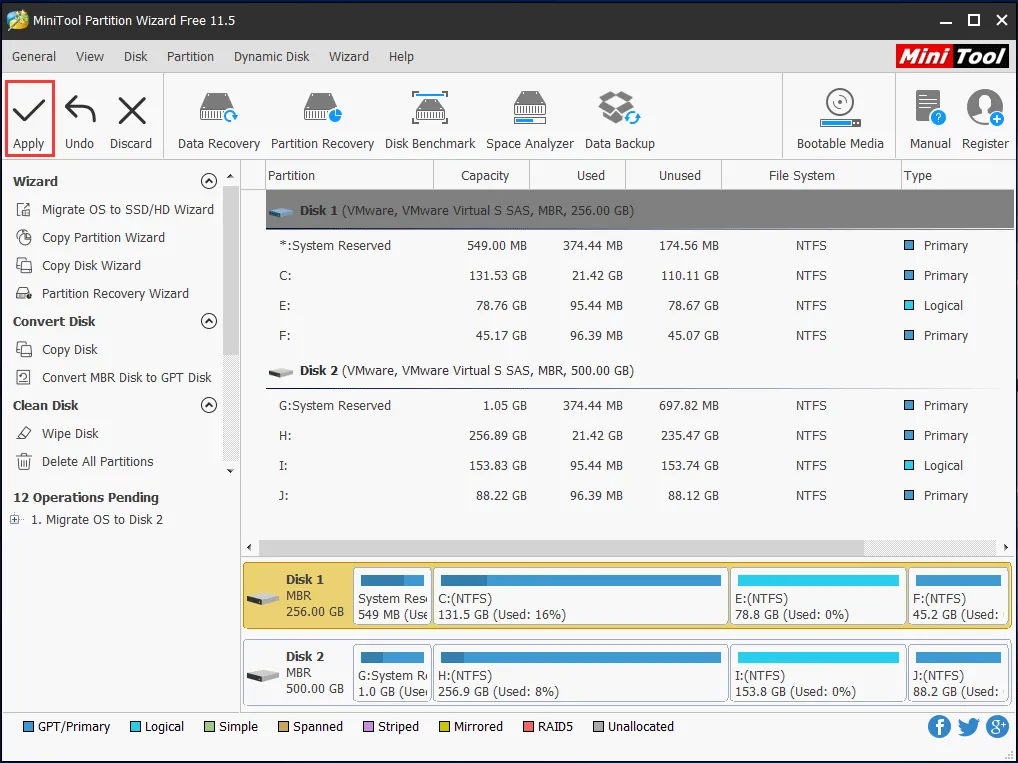 Giao diện chính của MiniTool sau khi thiết lập, nhấn Apply để bắt đầu quá trình cloningGiao diện chính của MiniTool sau khi thiết lập, nhấn Apply để bắt đầu quá trình cloning