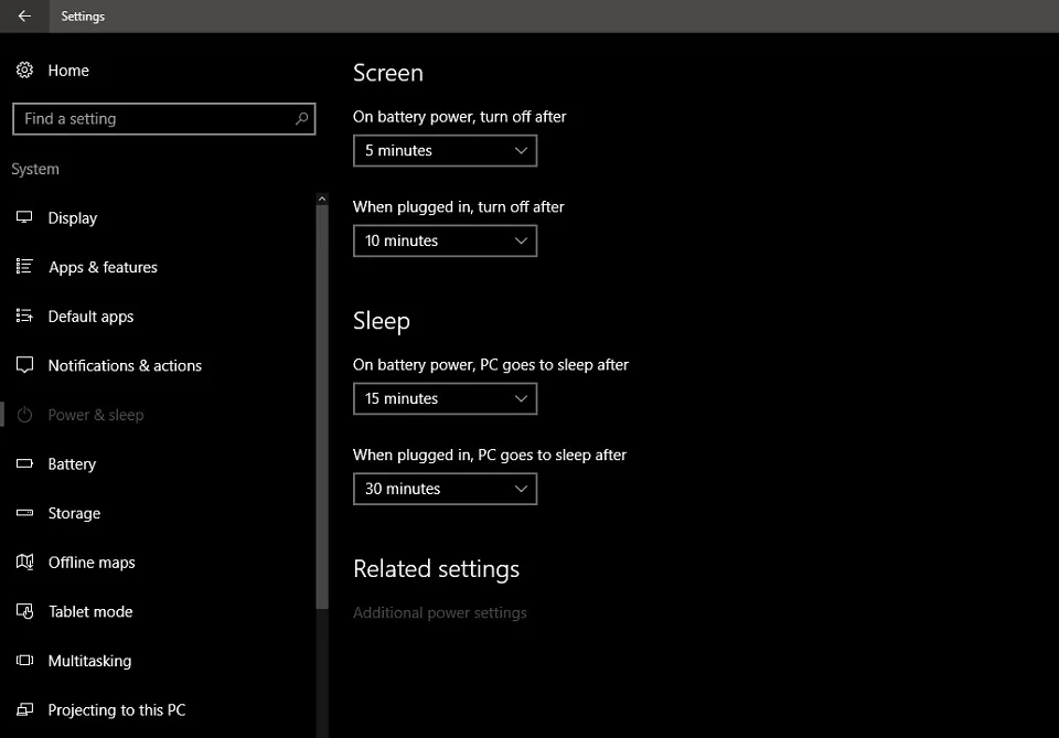- Điều chỉnh thông số Screen và Sleep trong mục “On battery power, turn off after” xuống mức thấp nhất bạn có thể chịu đựng (ví dụ: 5 phút cho màn hình, 10 phút cho Sleep).