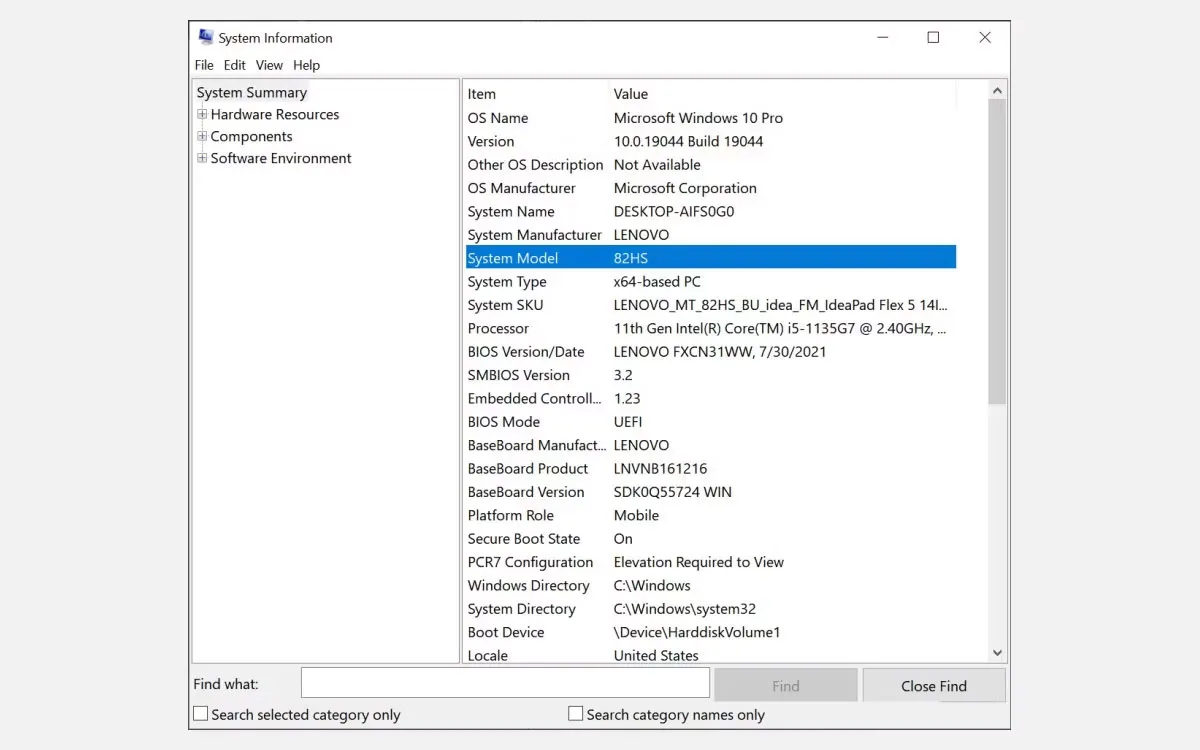 Để mở tiện ích này, bạn gõ “System Information” vào Windows Search và khởi chạy ứng dụng. Trong cửa sổ chính, đảm bảo bạn đang ở mục System Summary (Tóm tắt Hệ thống) ở cột bên trái. Ở khung bên phải, hãy tìm đến trường System Model để xem thông tin model laptop của bạn. Phương pháp này rất hữu ích cho việc kiểm tra chéo nhiều thông tin thông số kỹ thuật cùng một lúc.