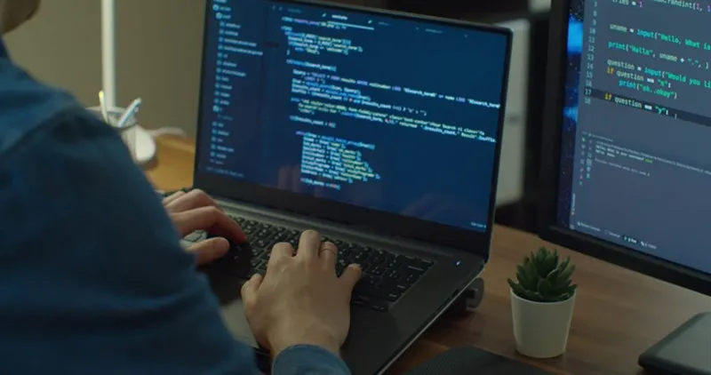 Ảnh minh họa laptop cho lập trình viên với màn hình lớn và môi trường code