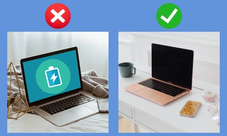 Tuyệt đối không đặt laptop lên các bề mặt mềm, bí hơi như chăn, gối hay đệm. Những vật liệu này chặn các khe thông gió, khiến không khí nóng bị giữ lại trong máy.