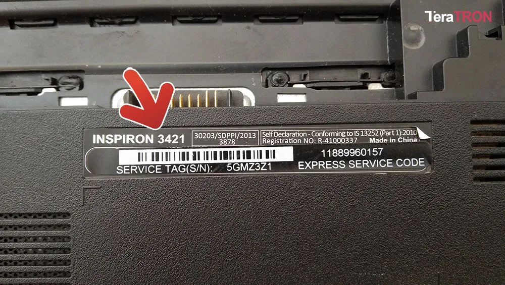Hình ảnh nhãn dán chi tiết hiển thị mã model laptop (ví dụ: Inspiron 3421) và các thông tin kỹ thuật khác