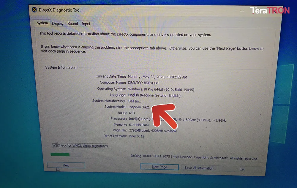 Hình ảnh màn hình DirectX Diagnostic Tool hiển thị thông tin chi tiết về hệ thống, bao gồm System Model (mã model laptop)