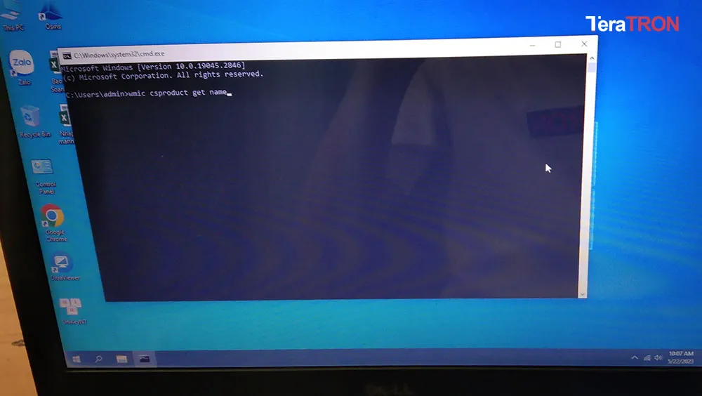 Hình ảnh cửa sổ Command Prompt (CMD) với lệnh wmic csproduct get name được nhập vào để xem mã model laptop
