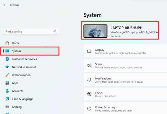 Người dùng điều hướng đến Settings > System > About (Cài đặt > Hệ thống > Giới thiệu). Tên model laptop Asus thường được hiển thị rõ ràng tại mục “Device name” hoặc “System type”.