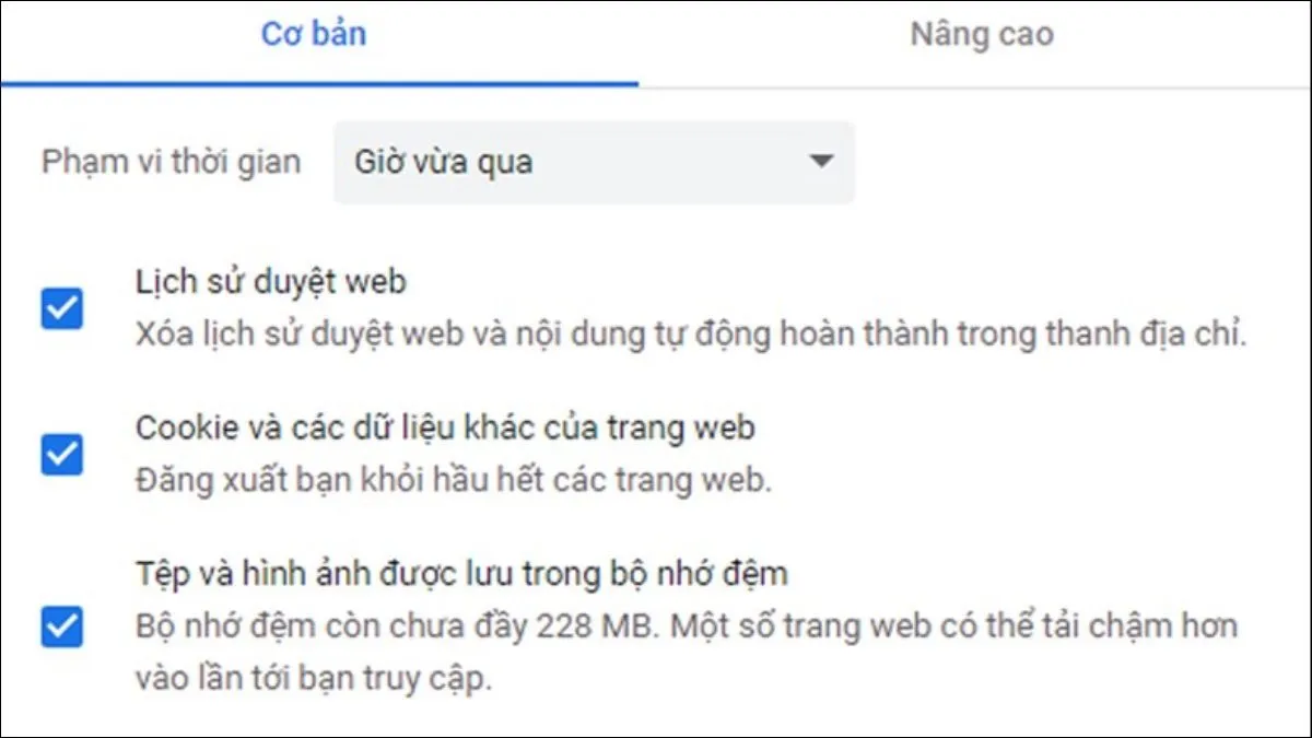 Ở tab Cơ bản, người dùng có thể chọn phạm vi thời gian muốn xóa. Các tùy chọn phổ biến gồm Giờ qua, 24 giờ qua, 7 ngày qua, 4 tuần qua, hoặc Toàn bộ thời gian. Sau khi chọn xong, hãy đánh dấu vào các mục cần xóa như Lịch sử duyệt web, Cookie, và Ảnh/Tệp được lưu trong bộ nhớ đệm.