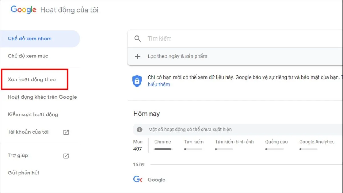 Nhấp vào mục "Xóa hoạt động theo" trong giao diện My Activity của Google